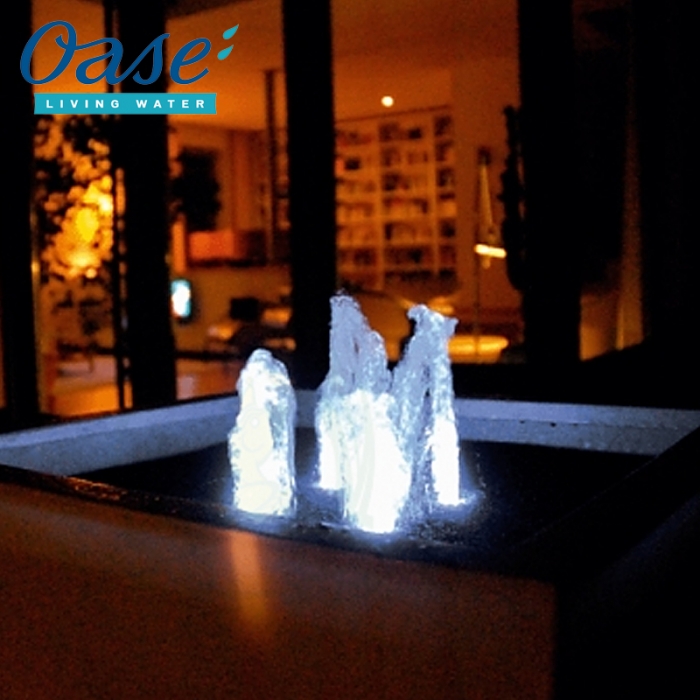 Osvětlení pramenitých kamenů ve zcela novém designu: Inovativní, bílé LED diody jsou chráněny vysoce kvalitním víkem z ušlechtilé ocele. Navíc činí inovativní hadicová sponka s výstupem na síťový kabel z instalace dětskou hru. Hadice je protnuta pod pramenitým kamenem, hadicová sponka je vsazena mezi ně. Síťový kabel tak může být zcela jednoduše vyveden skrz sponku. Žádné složité navlékání celou hadicí!